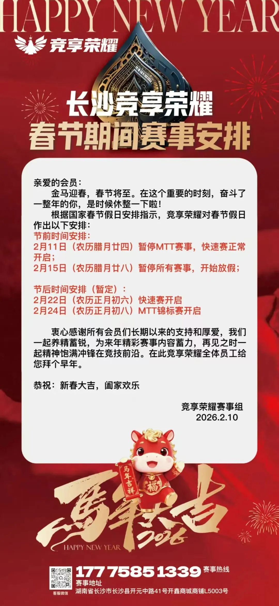 地址:湖南省长沙市长沙县开元中路41号开鑫商城商铺L5003号长沙喜奕竞技体育俱乐部⚡️ (MTT休息,快速赛正常开赛) ⚡️