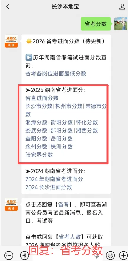 由于名单较长,宝子们找起来比较困难,大家可以扫描下方二维码,关注【长沙本地宝】,在后台对话框回复【省考分数】即可获取长沙历年进面分数以及株洲、湘潭等其他城市历年进面分数