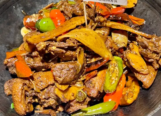 芷江鸭: 鸭肉切块,先在油锅里爆得紧实,皮要焦黄。重点是那把秋后的仔姜,切丝扔进去,猛火快炒。鸭肉吸了姜的辛辣,姜借了鸭的油润,咬一口,肉汁混着那股子冲劲儿,额头立马冒汗,痛快。