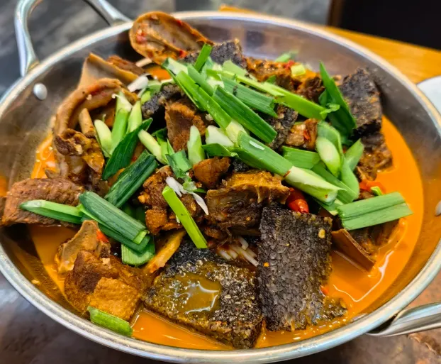 【血粑鸭】这不是普通的鸭子,灵魂在那个“血粑”。糯米泡好,拌上新鲜鸭血,蒸熟切块,先下油锅炸到外皮微焦。然后和鸭肉一起在锅里慢炖。咬一口,外皮酥脆,里面软糯,肉香和米香混在一起,辣味慢慢爬上来,额头微微冒汗,痛快。