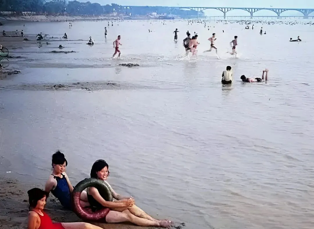图里这片水滩就是天然泳场,橘子洲那头桥身修长,岸上套着内胎的姑娘笑得灿烂,男孩子们一口气扎进水里,扑通一声溅起浪花,夏天的长沙就是这么过的,没花头,凉快就对了。