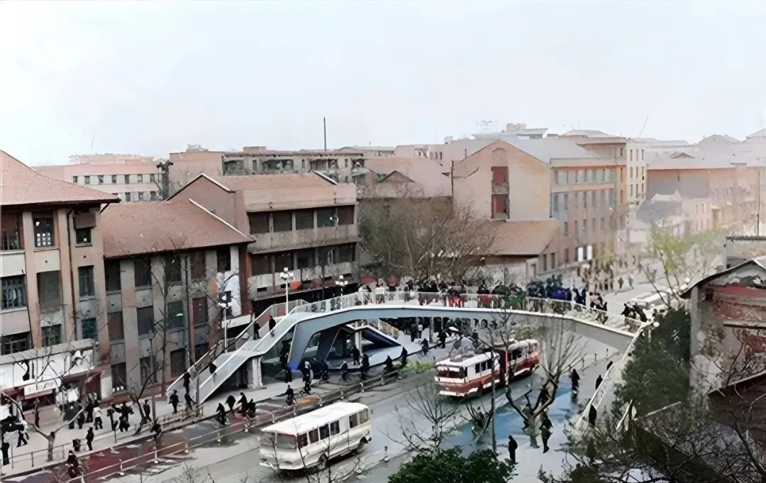 画面中这座白色弧桥是五一西路的人行天桥,八十年代的第一座,人从两边楼梯哗啦啦上去,下头两辆红白相间的公交钻过去,妈妈说桥上小贩多,买一包炒瓜子一路嗑到家。