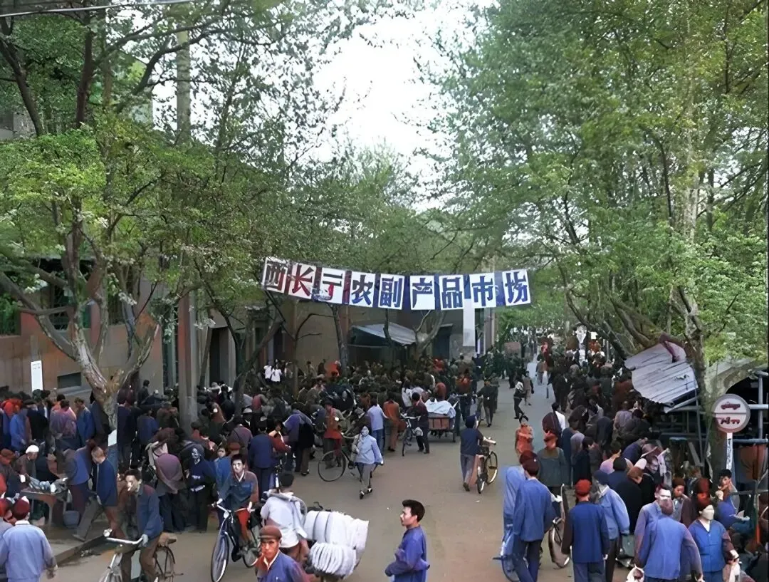 这条绿荫底下的人潮是西长街农副产品市场,小贩把秤砣啪啪一放,竹篮里活鱼尾巴拍水,买菜的大娘肩头搭着毛巾,嘴里还不忘砍价,两三句就成交,提着菜转身就走。