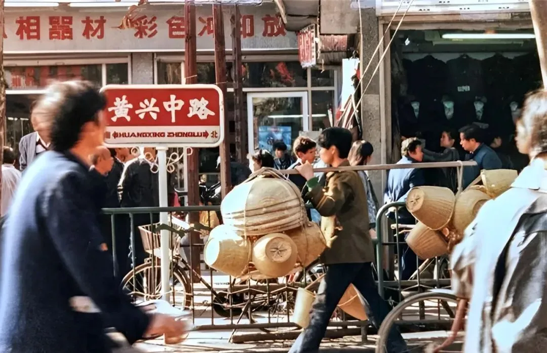 这块红牌子写着黄兴中路,街口摊贩挑着满满一担竹编,围观的人三三两两,口袋里有点闲钱就去黄兴南路吃碗面,或者钻进照相馆照一张证件照,简单却有盼头。