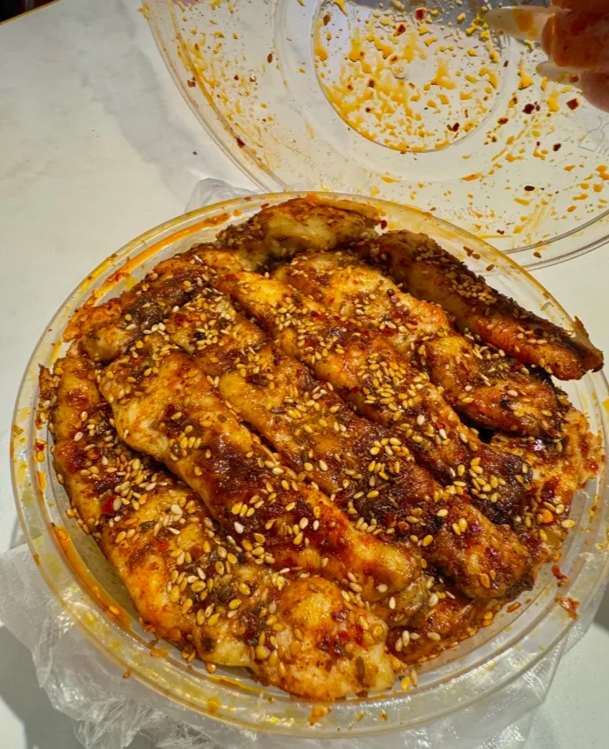 晚饭就简单些。河边有家做烧烤的,竹签随便拿几串,配一碗米酒。