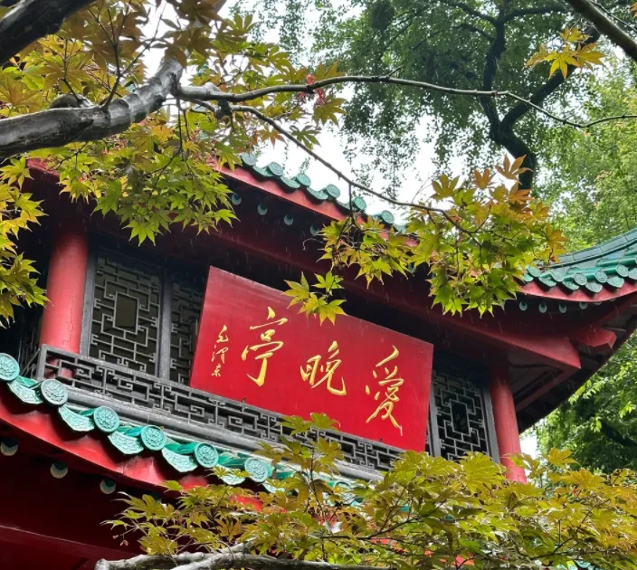 亭名取自杜牧那句“停车坐爱枫林晚”,一阵风起,叶子一红,照相都不用滤镜。