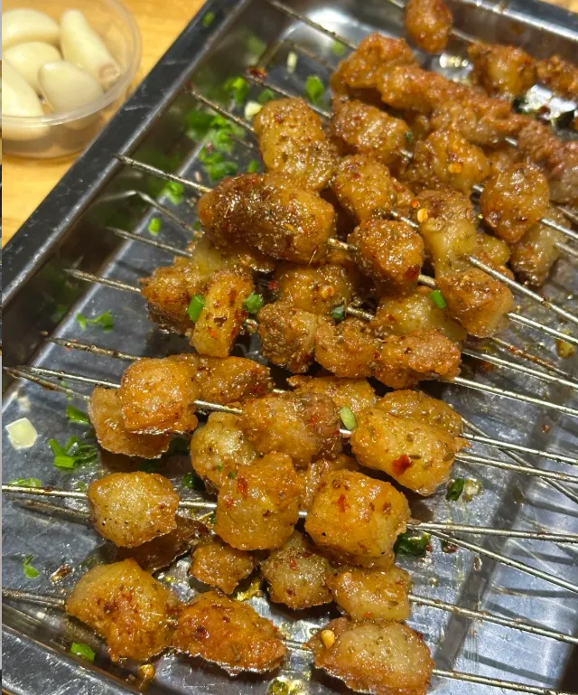 到了晚上,就是岳阳烧烤的天下。这里的烧烤不靠在那吆喝,靠的是那股子“牛油”香。 【岳阳烤牛油】 这绝对是岳阳烧烤的灵魂。选的是牛胸口那块最黄金的油,切成指甲盖大小的方丁。火候得极准,猛火快烤,撒上葱花和孜然。端上来时还在滋滋冒油,趁热一口咬下去,外皮是焦脆的,里面那股奶香味瞬间在嘴里“爆”开,不腻,反倒有种油脂带来的纯粹快乐,配上一瓶冰啤酒,绝了。