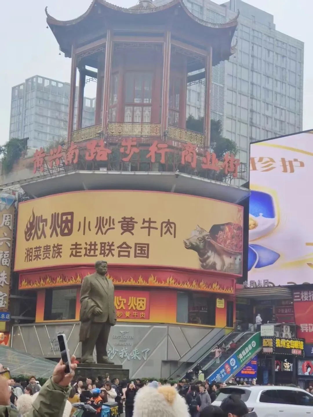 我们接着往前走,又路过了许多店。走着走着,突然走到了黄兴路步行街。这不是我们前天刚到的地方吗?怎么今天又走到了?我一看,这才恍然大悟,原来这条步行街是长沙的商业主干,它从南门口步行街到黄兴路步行街,再到五一广场、芙蓉广场,这一整条都是搞商业和旅游的地方。这样的话就可以集中商业,让更多的游客前往,也有很多的活动在这里举行,很丰富,很精彩。