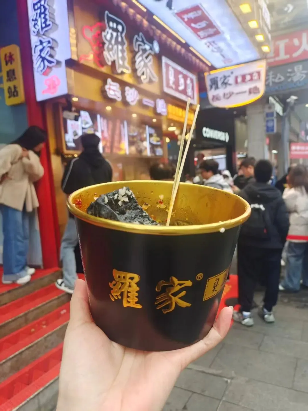 逛完三福呢,我们又去了很多潮玩店。走着走着,我们又饿了,妈妈点了一些牛肉串。牛肉串一口一个很好吃,味道也很不错,也不是特别辣,味道刚刚好。我们还点了当地门店很多的奶茶,那就是宁记。茶颜悦色人特别多,导致它有一些商品出现了缺货的情况,再加上它是纯茶饮料,不太适合我和妈妈,所以我们没有选择去品尝。但是有很多游客都会选择茶颜悦色,所以在这里我也比较推荐去尝一尝。