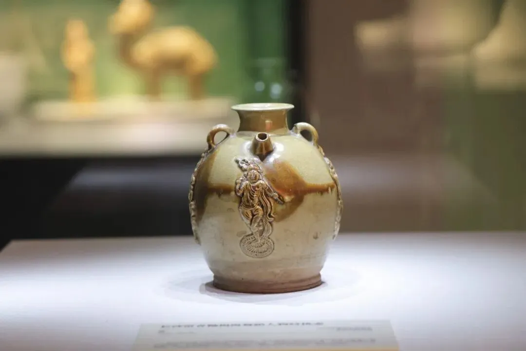 本次展览中,中国永久禁止出境展览的文物“长沙窑青釉褐斑舞蹈人物纹执壶”尤为引人注目,其采用的模印贴花工艺以及舞蹈人物、方形塔建筑和立狮图案据考应是依据海外订单需求定制。“唐代时,长沙窑的瓷器以产量多、性价比高为特色,不仅走入了千万寻常百姓家,也走到了东亚、东南亚、南亚、西亚乃至北非等地区,这样定制而成的外销瓷成为了当时的‘爆款’。”寻娟介绍。