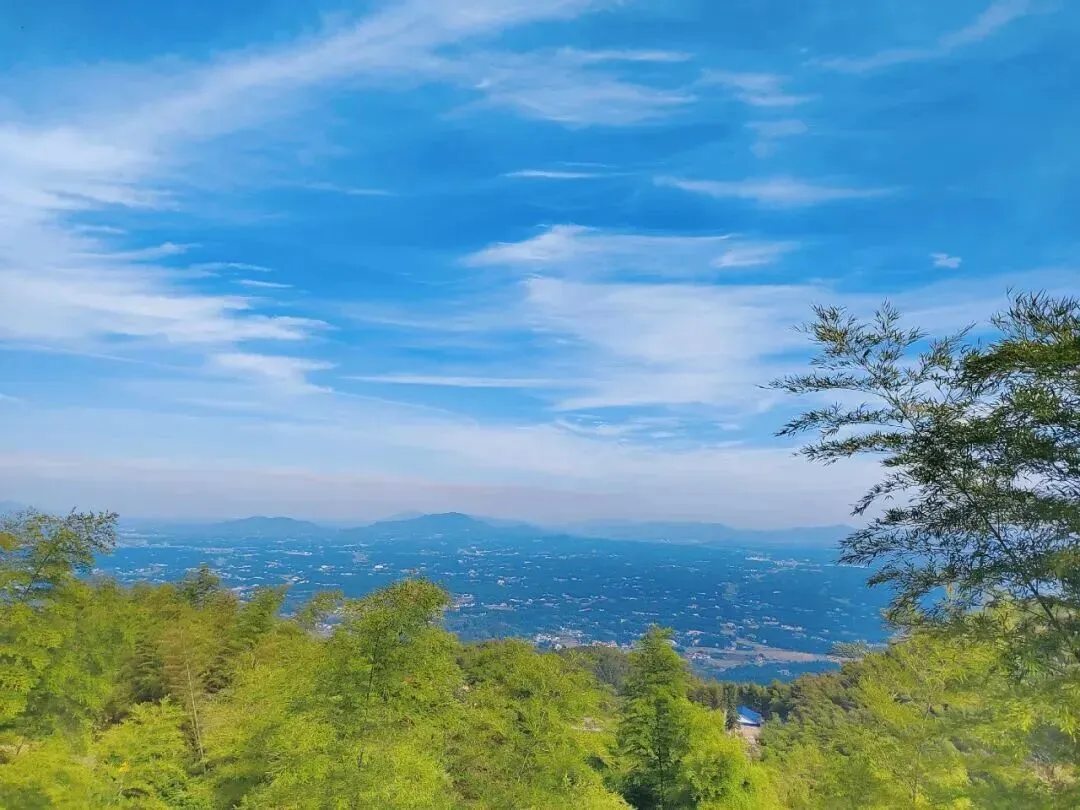 将车停在万寿宫停车场,便能顺着公路一路攀登,山腰间林立着大大小小的农家乐,隐约间可以看见山顶有一处朱红建筑高峻挺拔。路过太乙游龙拳发祥地和山腰处的养静禅寺,就可以拐上登山步道,最不容错过的观景台就在此处。