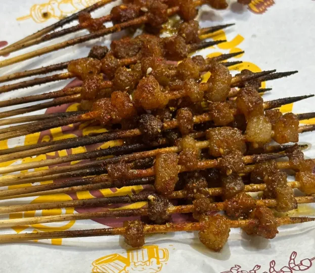 烤牛油:这玩意儿是岳阳烧烤的灵魂。选的是公牛胸口的油,切成指甲盖大小的方块。炭火一燎,油脂滋滋作响,撒上一把孜然和葱花。趁热咬下去,牙齿先触到表皮的焦脆,紧接着一股奶香味的油脂在嘴里“爆”开,不腻,反而带着一股韧劲,越嚼越香,两串下肚,配上一杯冰啤酒,神仙也不换。