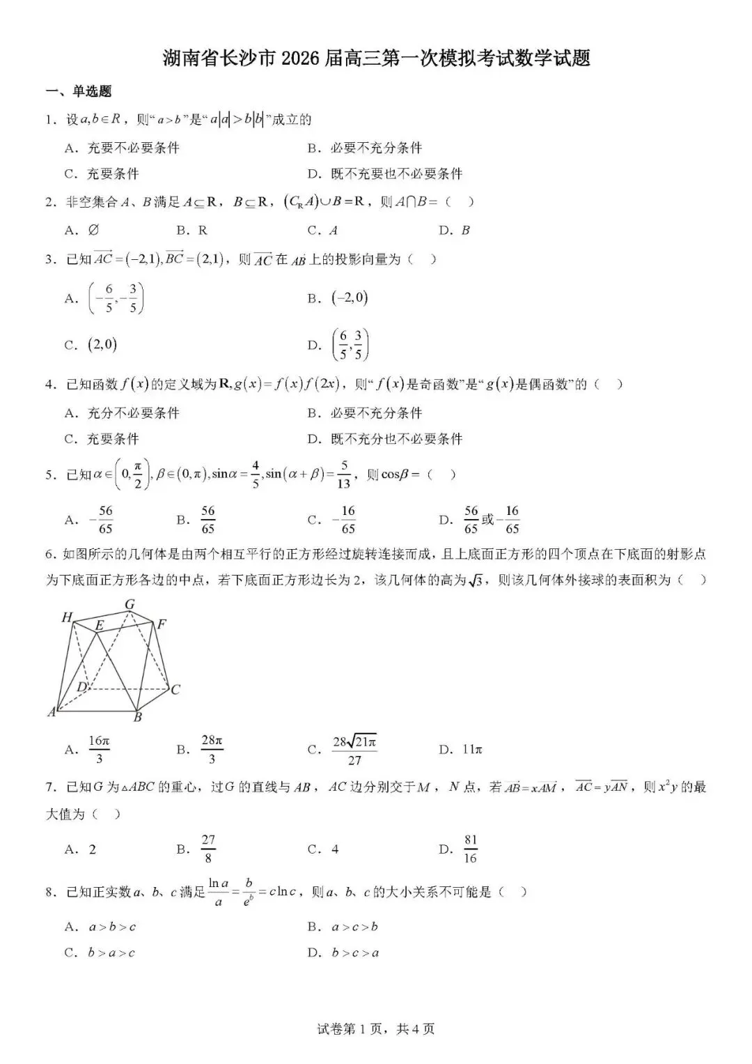 【最新试卷】湖南省长沙市2026届高三第一次模拟考试数学试题