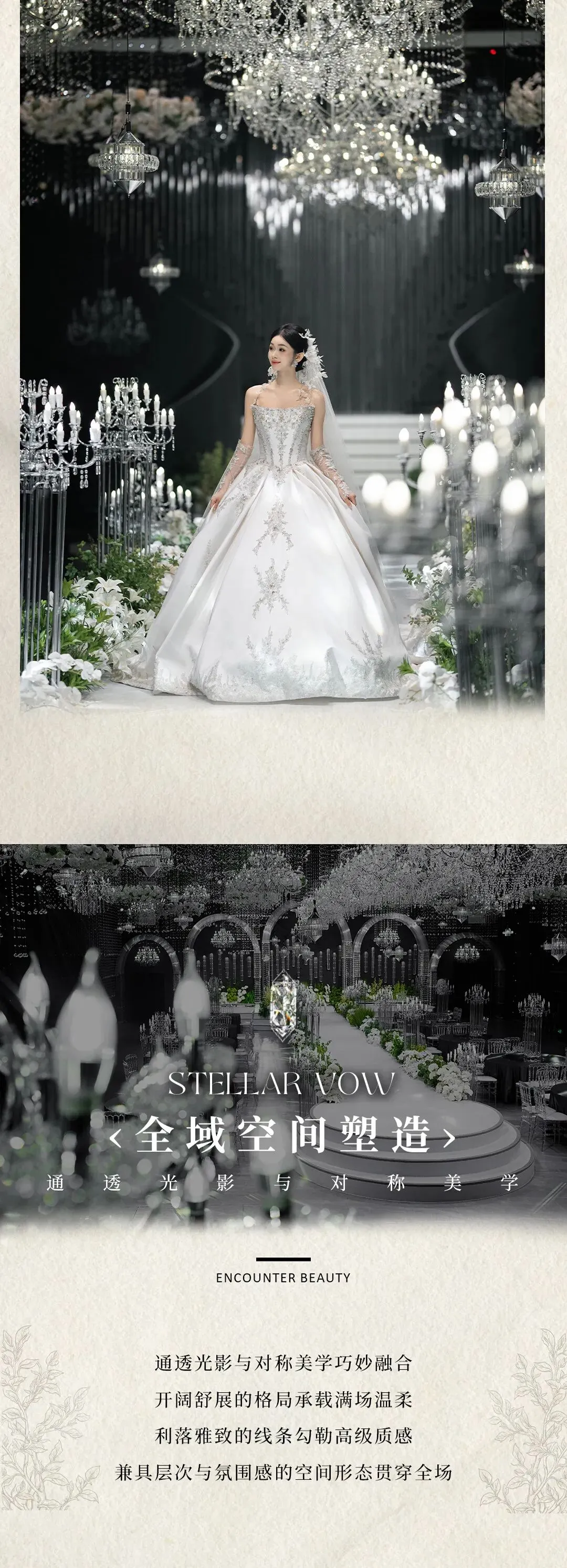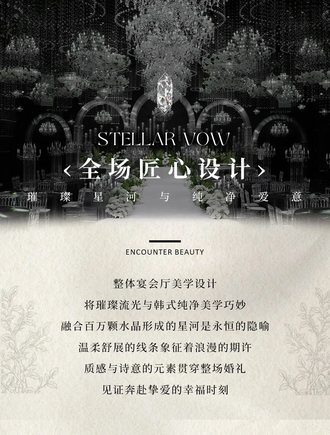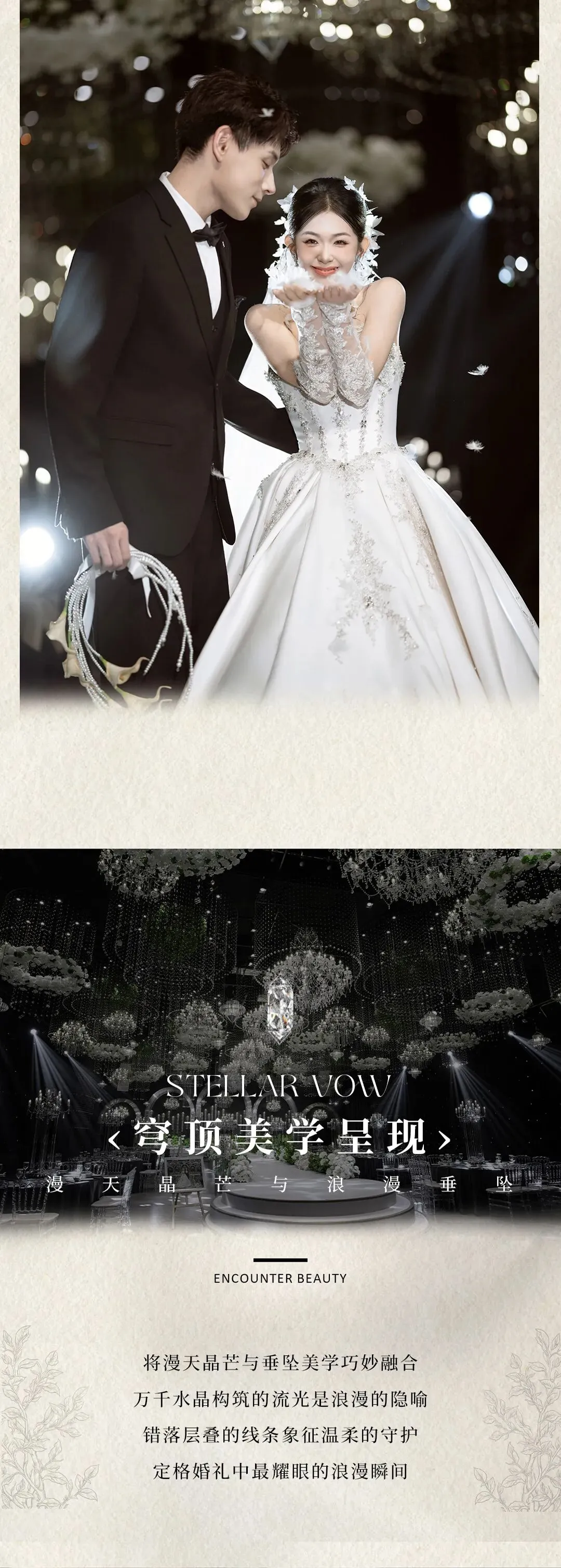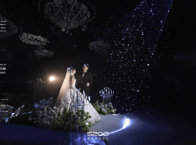 将璀璨流光与韩式纯净美学巧妙融合,百万颗水晶形成的星河是永恒的隐喻,质感与诗意的元素贯穿整场婚礼。
