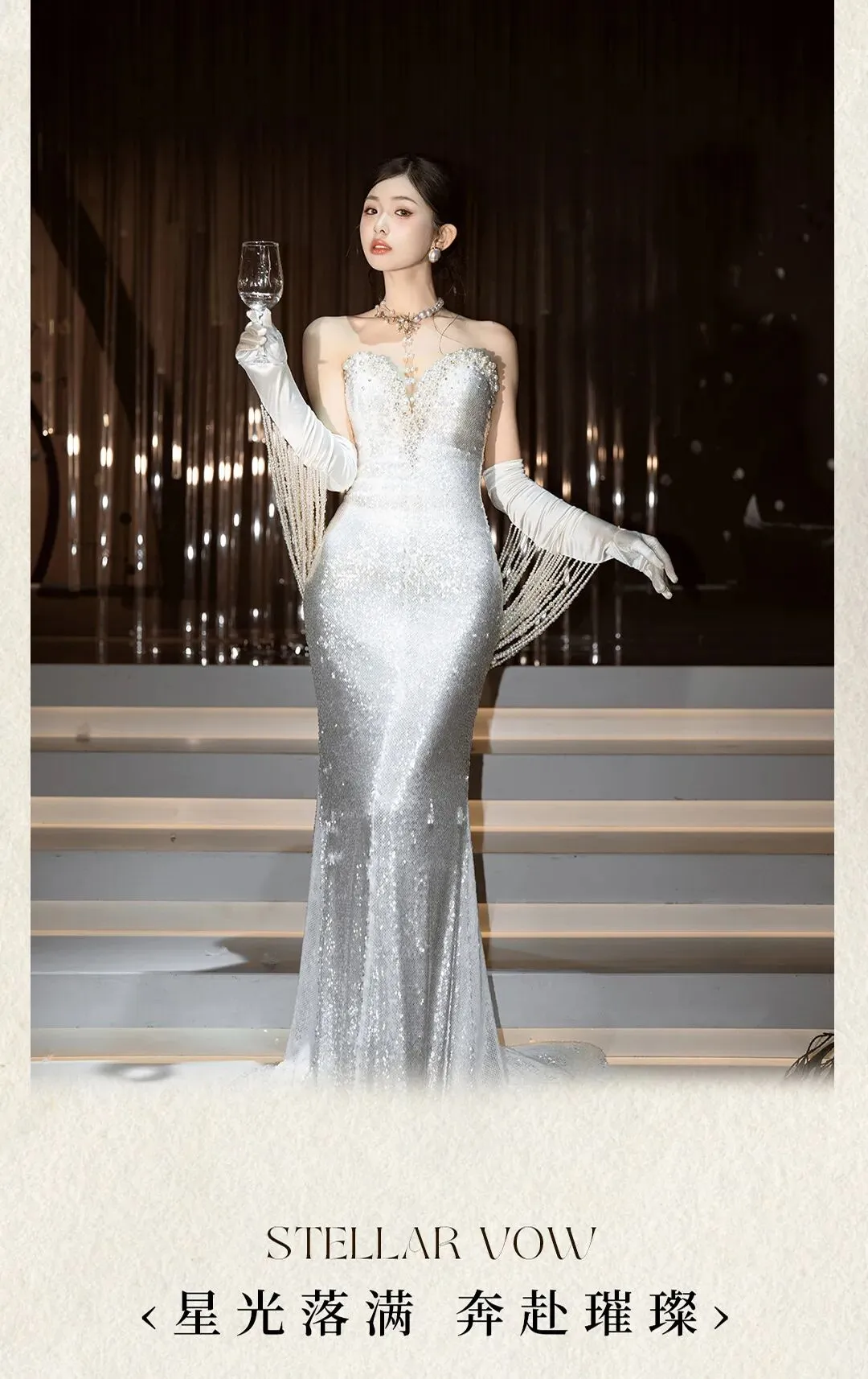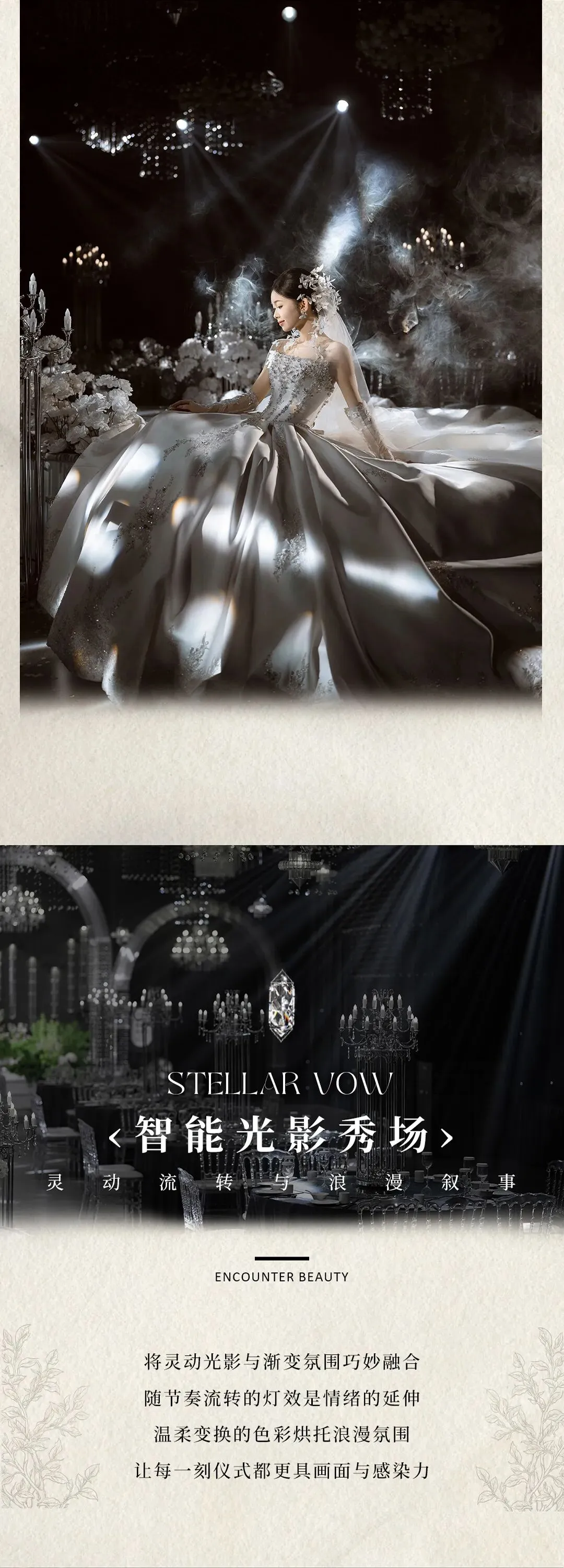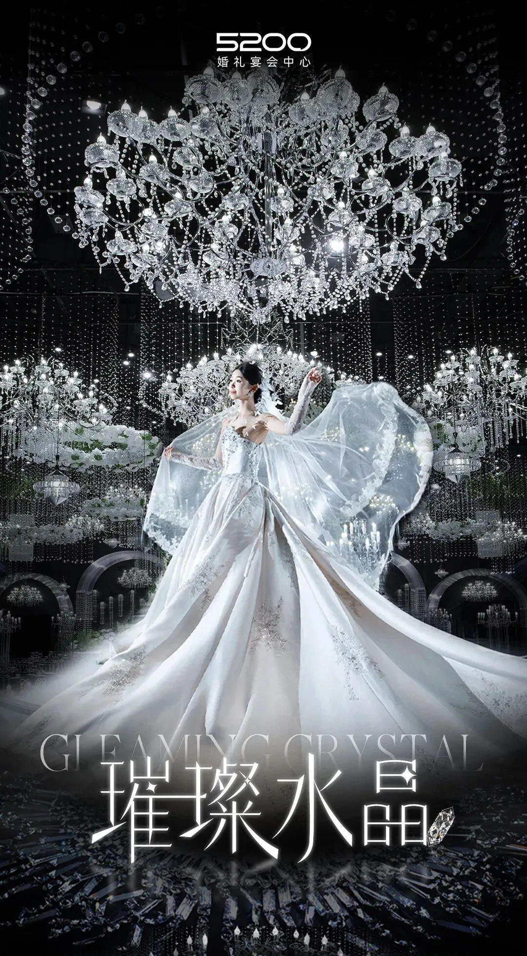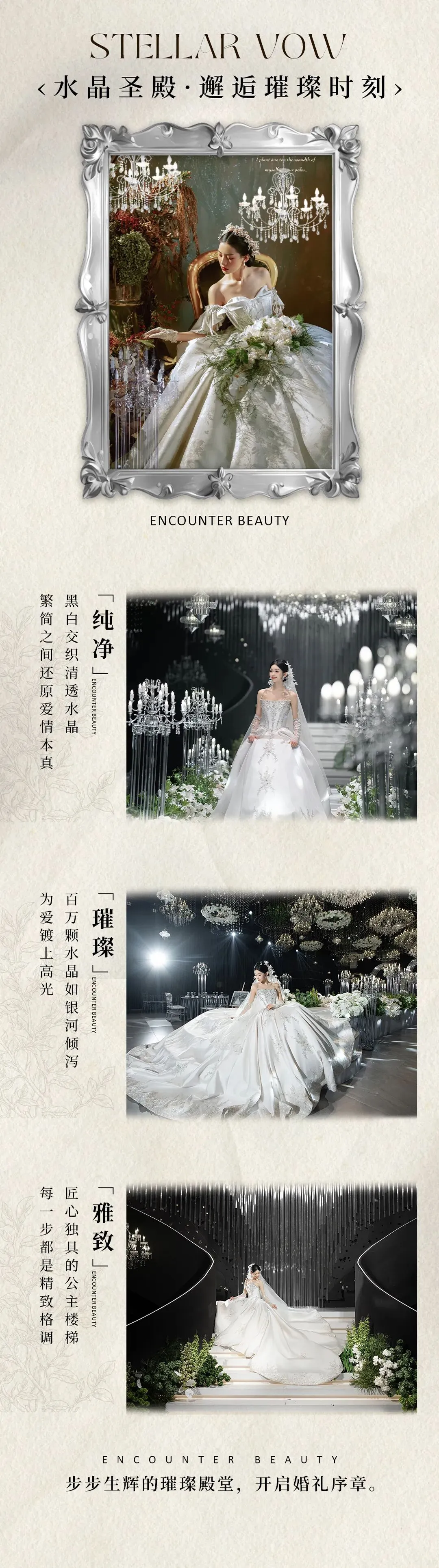 将璀璨流光与韩式纯净美学巧妙融合,百万颗水晶形成的星河是永恒的隐喻,质感与诗意的元素贯穿整场婚礼。
