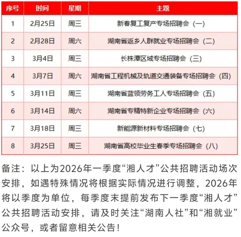 2026年一季度“湘人才"公共招聘活动安排预告