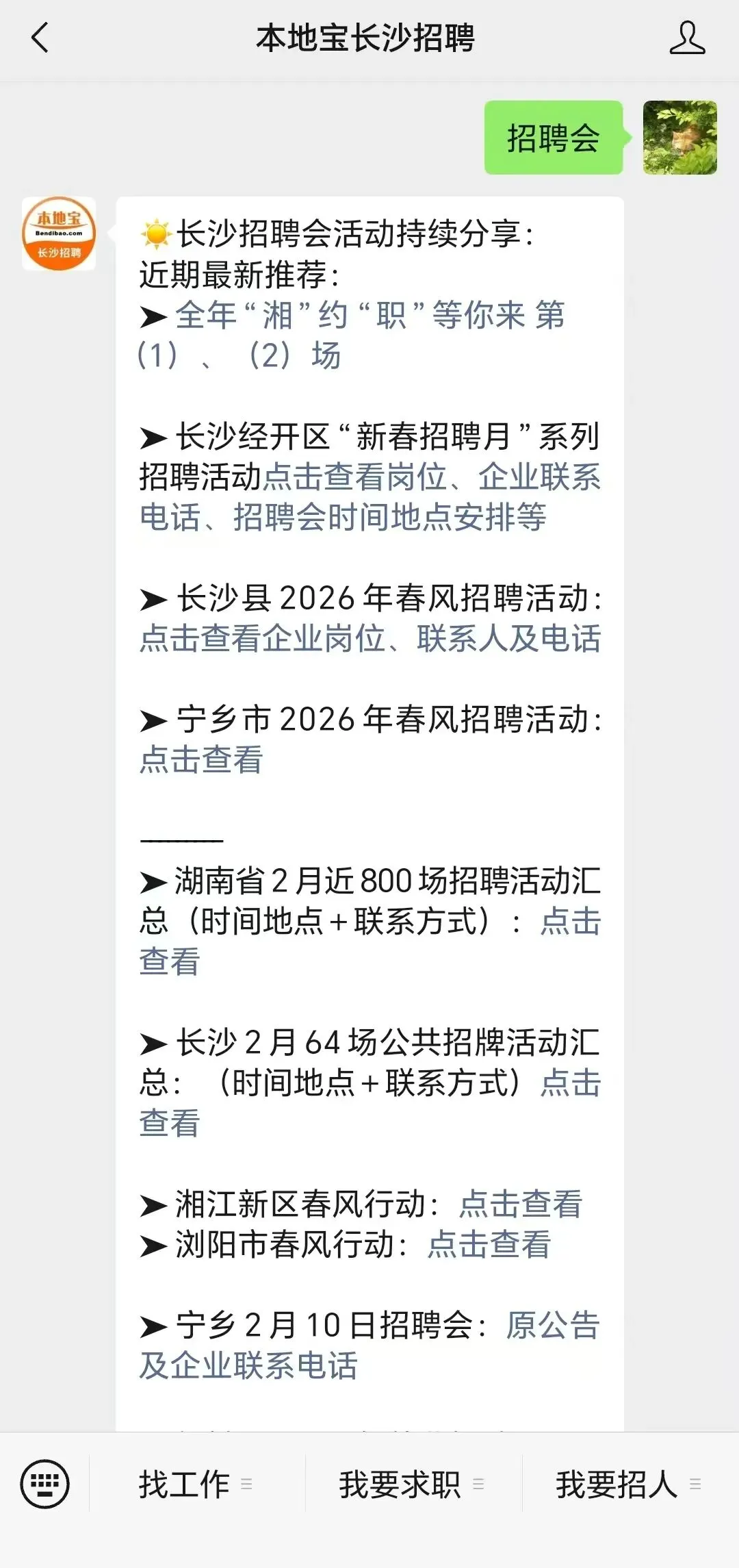 关注【本地宝长沙招聘】,在对话聊天框