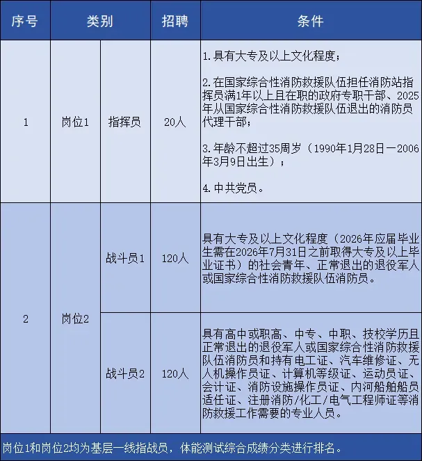 6.战斗员1需具有大专及以上文化程度(2026年应届大学毕业生需在2026年7月31日之前取得大专及以上毕业证书)。战斗员2需具有高中或职高、中专、中职、技校学历且正常退出的退役军人和国家综合性消防救援队伍消防员;