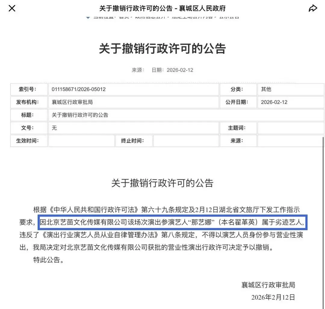 资料显示,湖北省襄阳市襄城区行政审批局于2026年2月12日发布公告,认定那艺娜(本名翟革英)违反《演出行业演艺人员从业自律管理办法》第八条规定,不得以演艺人员身份参与营业性演出,该局决定对北京艺苗文化传媒有限公司获批的营业性演出行政许可决定予以撒销。
