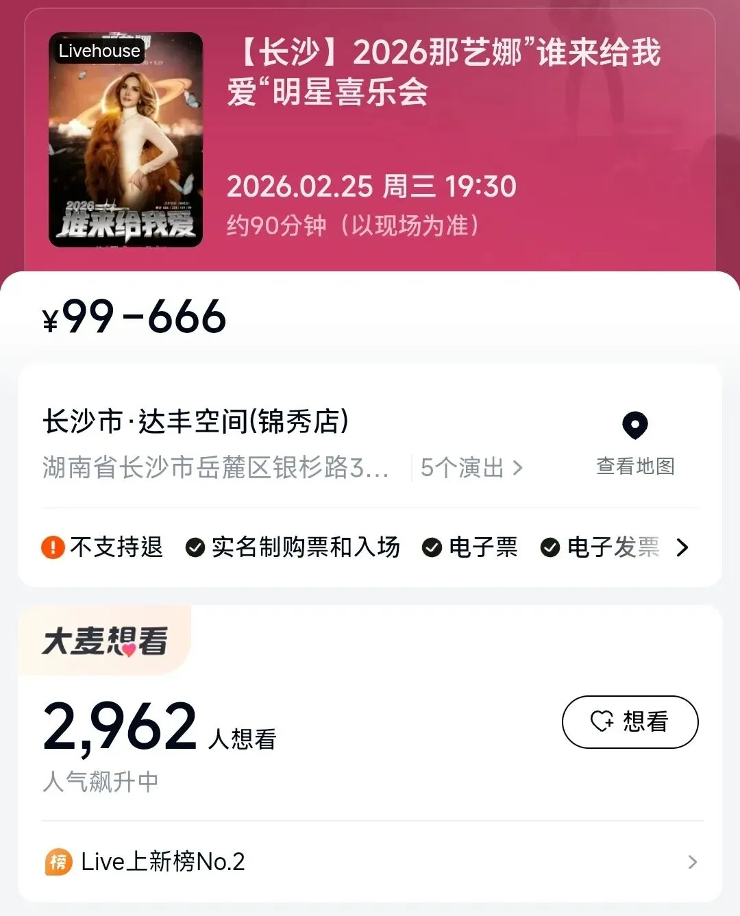 值得注意的是,在长沙举办喜乐会仅半年之后,那艺娜又要来长沙公开演出捞金了。据下大垅了解到,长沙的达丰空间近日发文预告,2026年那艺娜「谁来给我爱」明星喜乐会长沙站正式官宣,将于2月25日在长沙举办喜乐会。
