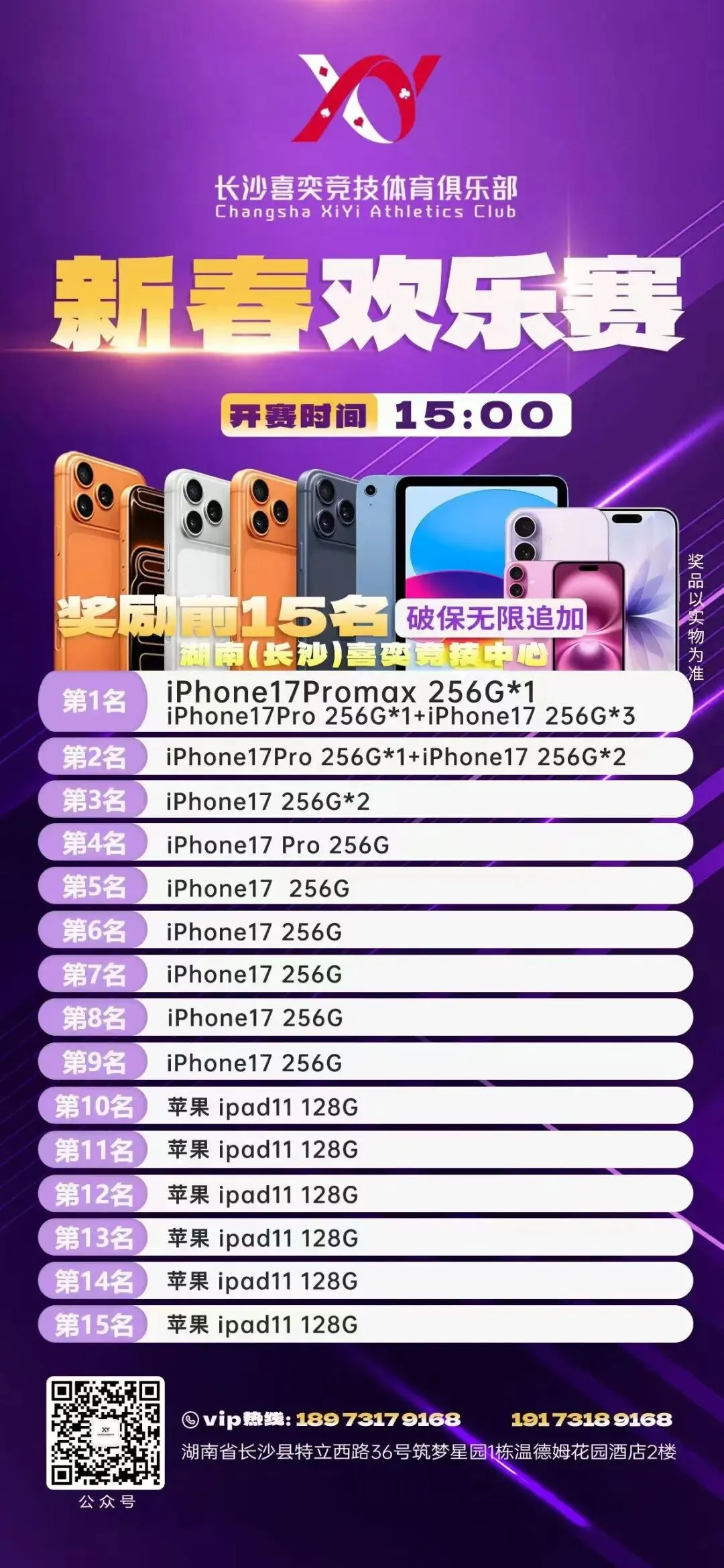地址:湖南省长沙市岳麓区潇湘北路与潇湘南路交汇处圆泰·长沙印写字楼高区34层地址:湖南省长沙市芙蓉区马王堆街道保利中环广场A4栋21楼长沙阳光智力竞技俱乐部