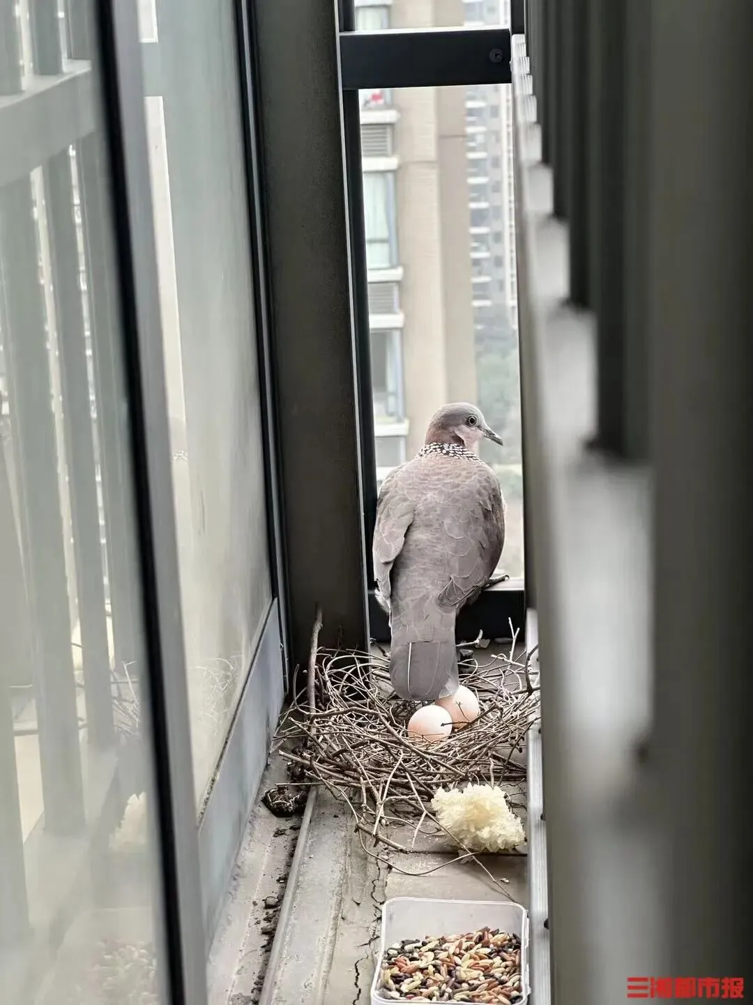 付女士回忆,一个多月前,她发现阳台护栏转角处多了几根枯枝,起初并未在意,随手清理。不料没过几日,树枝又渐渐增多,她这才发觉,是一对珠颈斑鸠专程衔枝来此安家。此后她特意固定好窗户,还在附近撒下大米,很快便被小鸟取食殆尽。