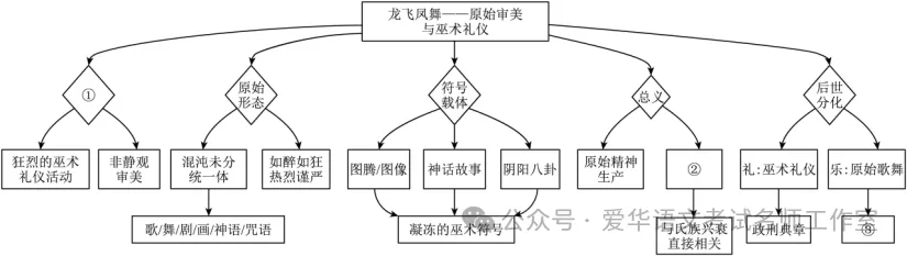 ①处:根据图中“狂烈的巫术礼仪活动”“非静观审美”等内容,结合材料一“它们是一种狂烈的活动过程。之所以说‘龙飞凤舞’,正因为它们作为图腾所标记、所代表的,是一种狂热的巫术礼仪活动”“龙飞凤舞——这种原始的审美意识和艺术创作并不是观照或静观”可知,此处可填“本质特点”。