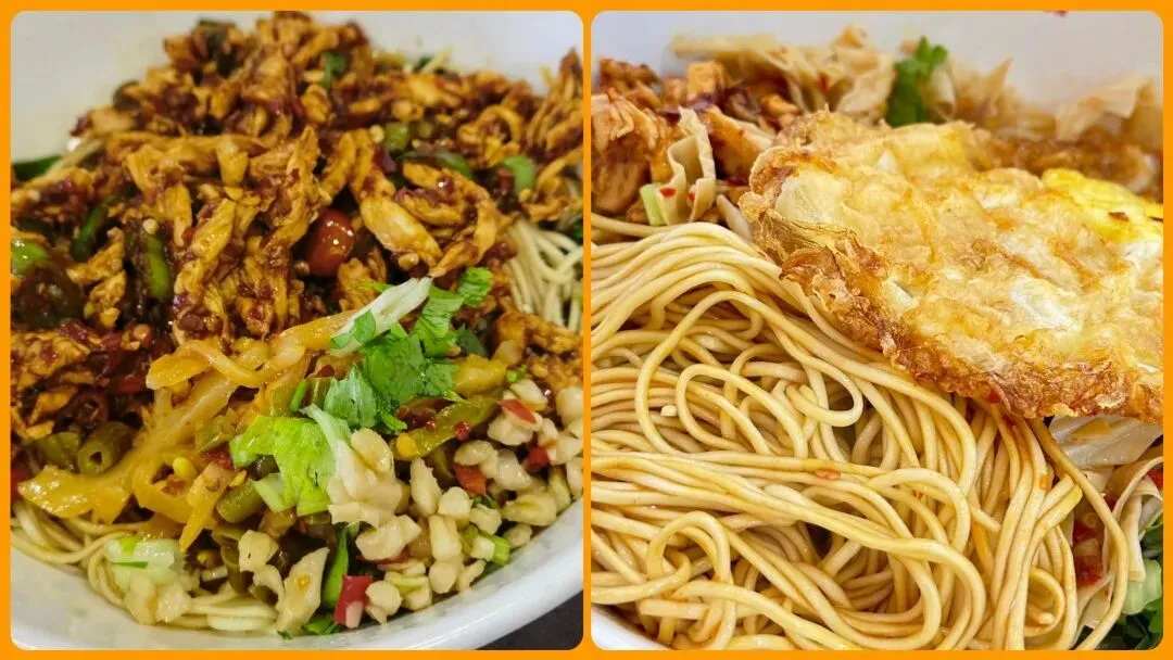 麻辣鸡丝粉,口味有点重,但是入味又锅气的青椒炒麻辣鸡肉丝,再加着配菜区自助的榨菜、芹菜、大蒜子,一起拌面,口感丰富,味道好,吃到嘴里特别满足。