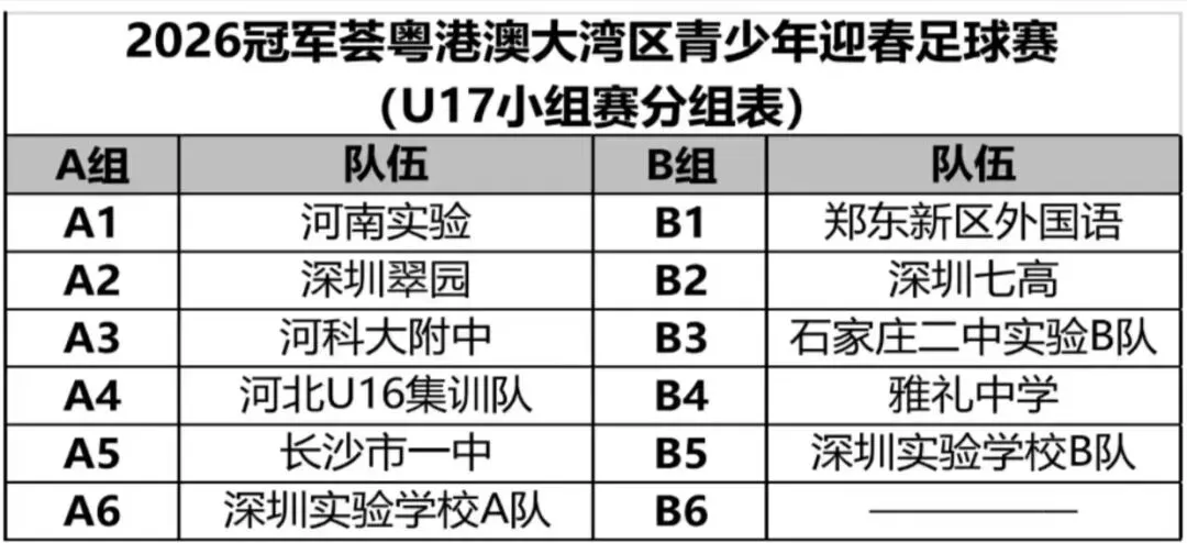 2月23日大年初七上午,2026冠军荟粤港澳大湾区青少年迎春足球赛(U17组)将拉开小组首轮比赛帷幕。据悉,雅礼中学和长沙市一中将和来自深圳、河南、河北等地的九支队伍争夺冠军。本次冠军荟粤港澳大湾区青少年迎春赛共11支队伍参赛分成两个小组,长沙市一中和河南实验、深圳翠园、河科大附中、河北U16集训队、深圳实验学校A队分在A组,雅礼中学则和郑东新区外国语、深圳七高、石家庄二中实验B队、深圳实验学校B队分在B组。赛制两个小组进行单循环较量,各小组积分前两位的球队晋级四强通过交叉淘汰赛产生争夺冠军球队。根据赛程安排,长沙市一中在23日下午两点首战深圳翠园,而雅礼中学则在23日下午四点半首轮对阵石家庄二中实验B队。