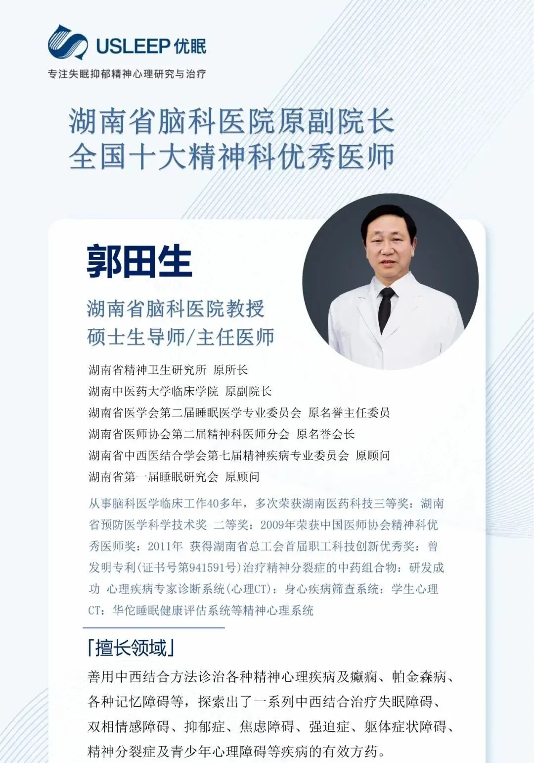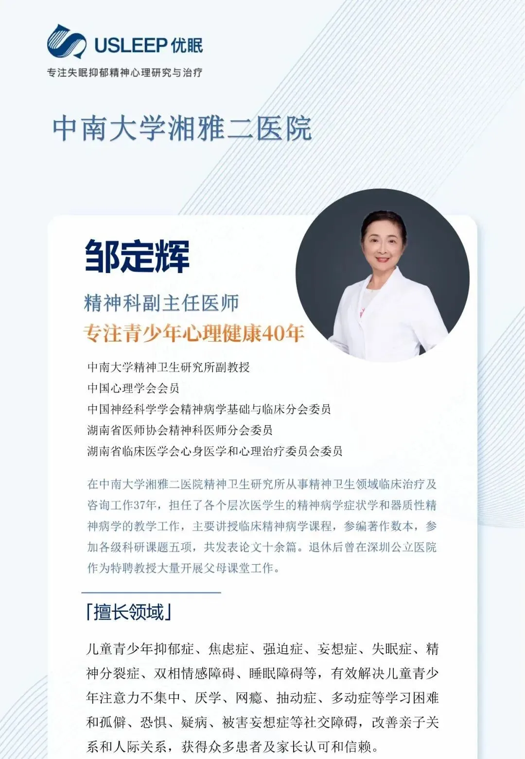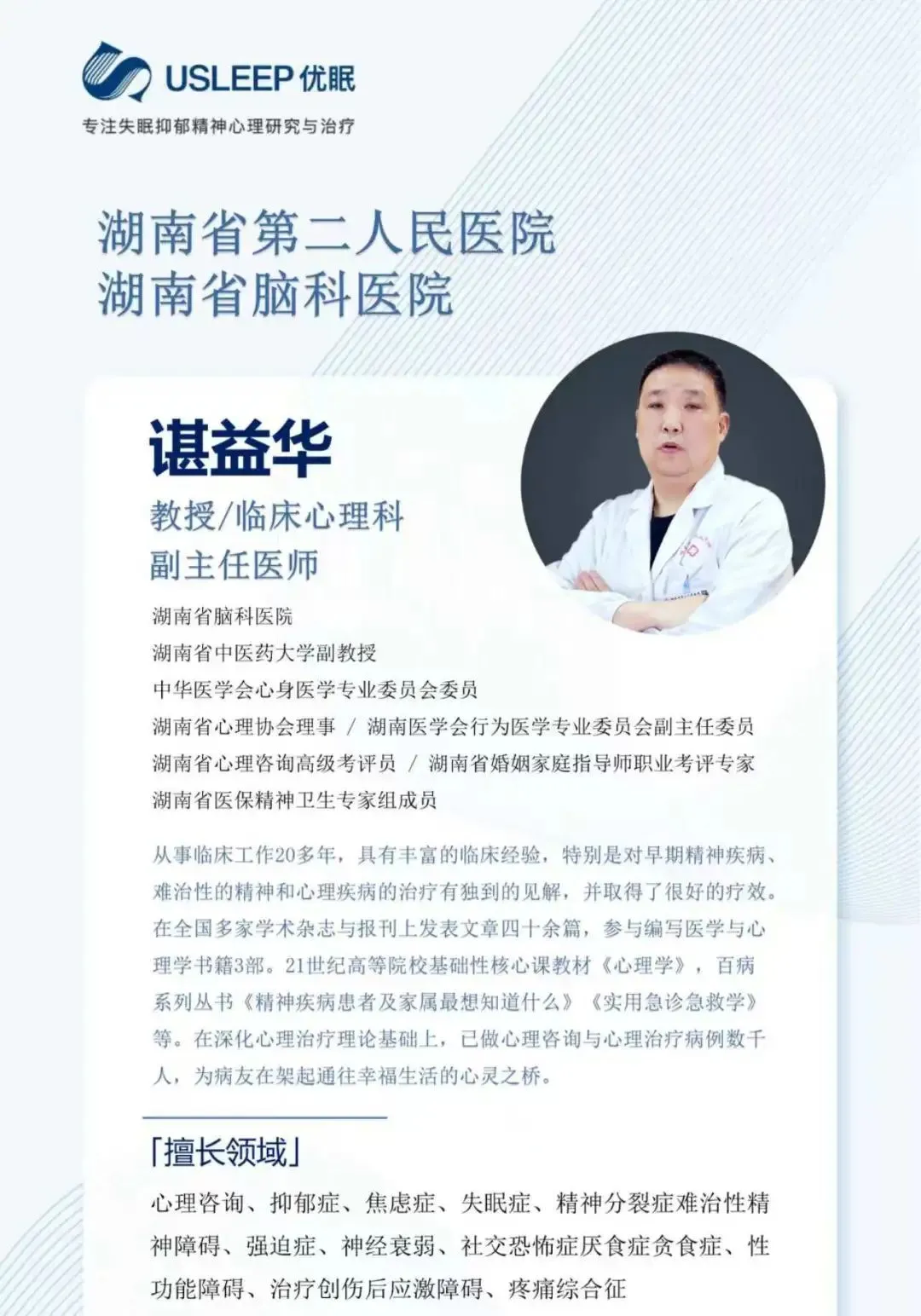 长沙优眠医学中心精神心理科依托“临床诊疗+心理疏导”、物理治疗、中西医结合治疗的科学诊疗,致力于精神心理疾病领域的临床研究与实践工作,对复杂性疑难性精神心理疾病诊治有丰富的经验,以精湛的医疗技术,优质的服务,为您提供个性化的临床心理医疗解决方案及全方位精神心理疾病咨询诊疗服务。
