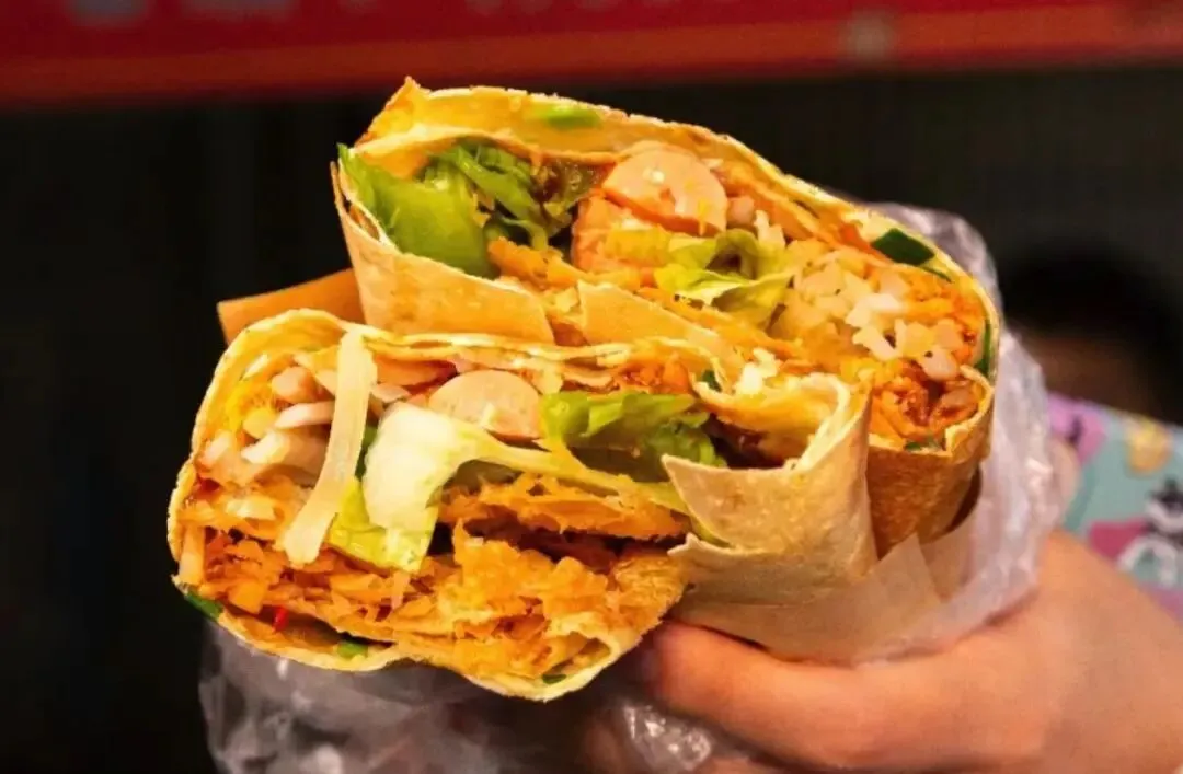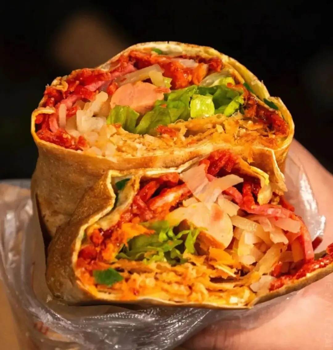我最喜欢加鸡蛋、肉松和土豆丝,甜咸口的非常好吃。饼皮很有嚼劲,哪怕包了很多菜也不会断,大口咬下去太满足了。