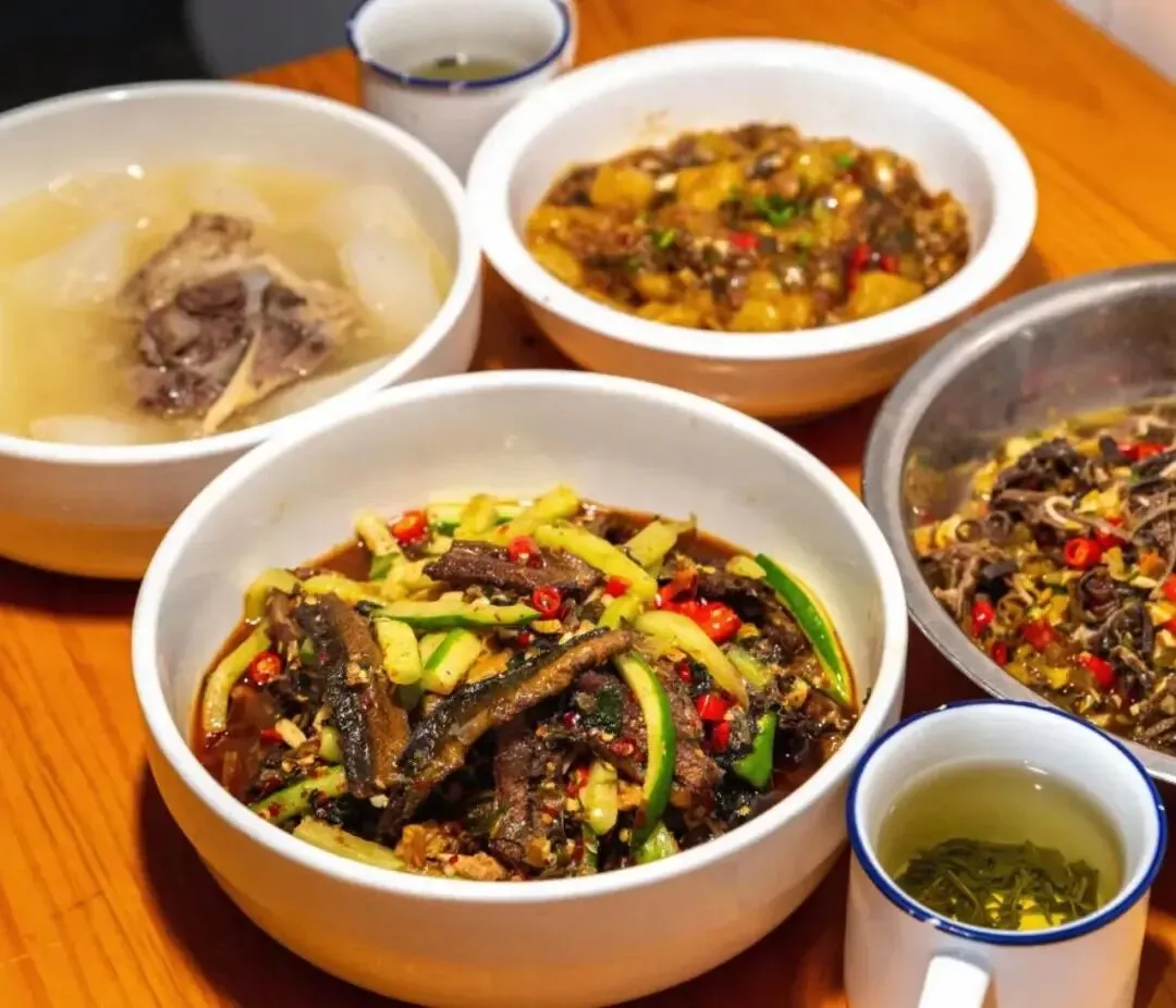 这就是自家的老房子改的,环境非常简陋,位置也偏,但就是有人愿意开车穿过大半个长沙来吃。 进店直接看着菜点,想吃哪个拿哪个,非常新鲜。萝卜筒子骨汤特别清甜,萝卜煮得烂烂的。黄瓜炒鳝鱼加了酸菜和辣椒,特别下饭,我能连吃三碗。