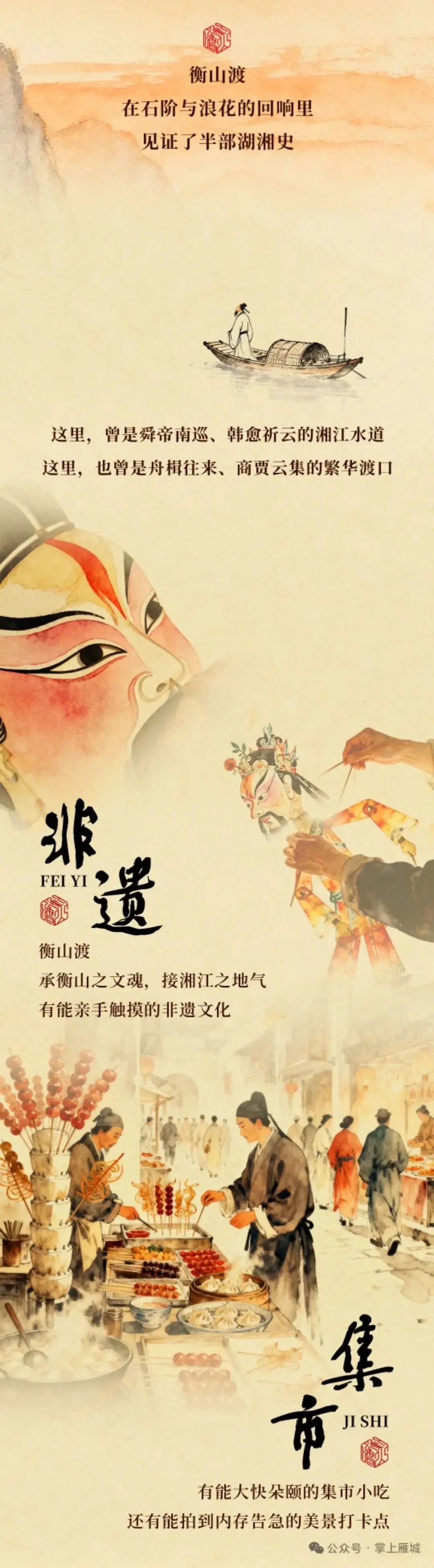 第七天:早餐后乘车去往衡阳市衡山县,游览湘江流域著名的衡山古渡——白马名津。湘江悠悠,石阶依旧,号子声远,潮涌新程。【衡山渡·湘江渡口民俗文化印象体验地】坐落于衡山县湘江之畔,融合渡口记忆、市井烟火与民俗非遗,是集旅游、商业、文化、休闲于一体的沉浸式街区。涓、蒸二水如同衡山双臂,拥抱湘江干流,使衡山渡成为连接湘中、湘南与长江的水陆转换枢纽。北上可经湘入长江直抵中原,南下可控摄两广,西进则扼守云贵门户。这天然的通达之利,正是曾国藩、彭玉麟在此操练水师、经营后勤的深层地理根由。正因这不可替代的枢纽地位,衡山在后世屡成决策中枢。抗日战争时期,蒋介石将最高军事指挥部设于南岳衡山,召开数次关乎国运的军事会议。解放战争后期,中共重要领导人陶铸亦曾筹划将中南指挥部设于此处。历史的选择,一再印证了这片山水是一部千年未歇的交通与战略史诗。晚餐后入住酒店。