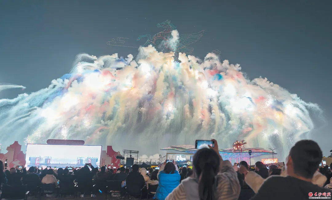 正月初五晚,一场年味“天花板”级别的视觉盛宴在浏阳天空剧场上演。众多观众在绝美的焰火中开启一场集体奔赴的追光之旅。晚会融合高科技无人机矩阵与艺术化定制焰火,只见“七彩祥云”横贯夜空,天马踏着祥云徐徐升起,色彩绚丽、形态逼真,一幅气势磅礴的新春画卷令人如痴如醉。