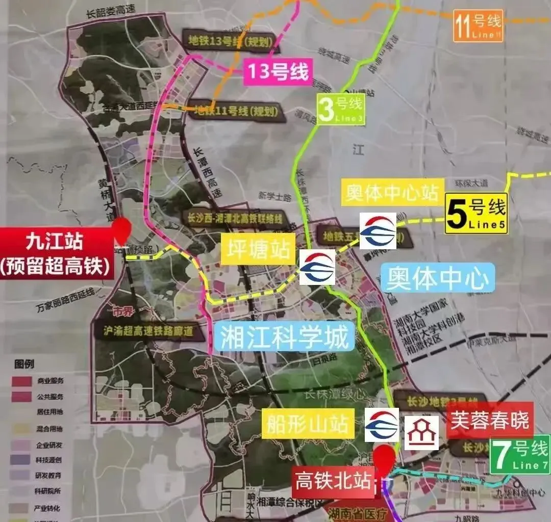 - 地铁网络:地铁 3 号线直达片区,5 号线南延 + 西延同步推进,未来将跨湘江接入湘江科学城核心区,与地铁 3 号线换乘,实现长沙主城与西南片区的轨道互通。