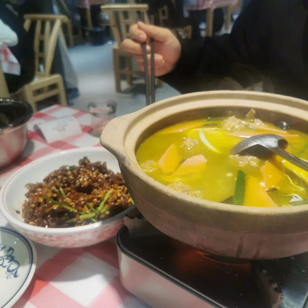 菜很快上了两道,装小米饭的小蒸锅也端了上来。儿子没多想,直接给我们每人盛了一满小碗,一锅米饭转眼就见底了,我们就着菜吃得正香,却迟迟不见肉汁拌饭上桌。等我们吃得差不多停下筷子,小服务生端着肉丝酱汁过来,一揭锅盖愣住了:“啊?米饭呢?”我们这才尴尬地反应过来——原来这锅米饭,就是用来做肉汁拌饭的,我们压根没点单独的米饭,直接把拌饭的米饭先吃光了。旁边一位三十多岁的领班小哥看得明白,人特别大气,笑着说:“没事,再给你们上一锅。”一场小乌龙,反倒成了旅途中最难忘的笑点。