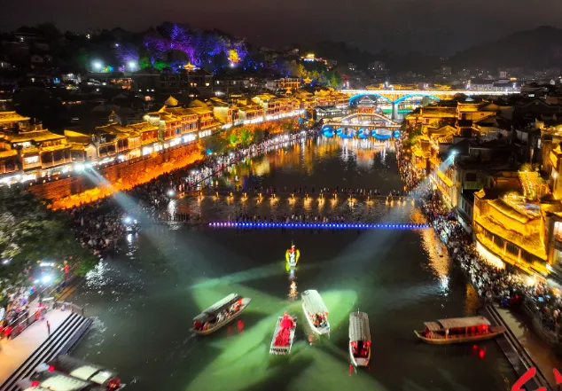早餐后(约2小时车程)前往游览【芙蓉镇】本名王村,是一个拥有两千多年历史的古镇,因宏伟瀑布穿梭其中,又称"挂在瀑布上的千年古镇"。位于湘西土家族苗族自治州境内的永顺县,与龙山里耶镇、泸溪浦市镇、花垣茶峒镇并称湘西四大名镇,又有酉阳雄镇、"小南京"之美誉。后因姜文和刘晓庆主演的电影《芙蓉镇》在此拍摄,更名为"芙蓉镇"。后(约2小时车程)前往凤凰,晚上【沱江泛舟夜游】坐上乌篷船,听着舩公的号子,看着两岸已有百年历史的土家吊脚楼,别有一番韵味......