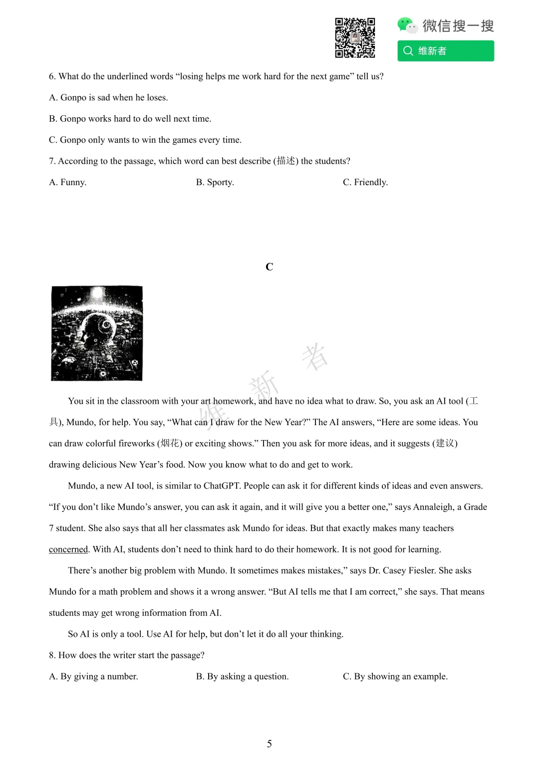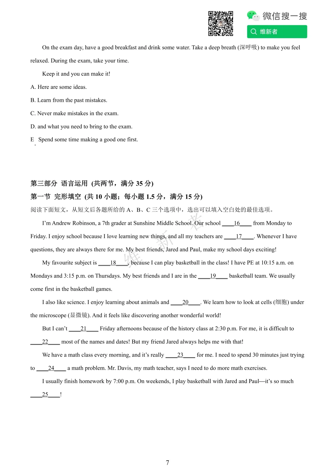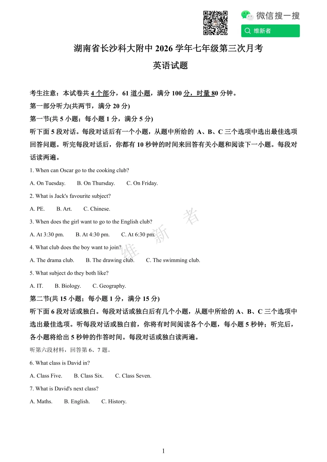 维新者致力于收集和整理各大名校试题,帮助您省心省力获取各类优质的试卷与教辅资源。我们这次带来的是湖南省长沙科大附中2026学年七年级第三次月考英语试题及答案,希望能够有助于您孩子的学习。