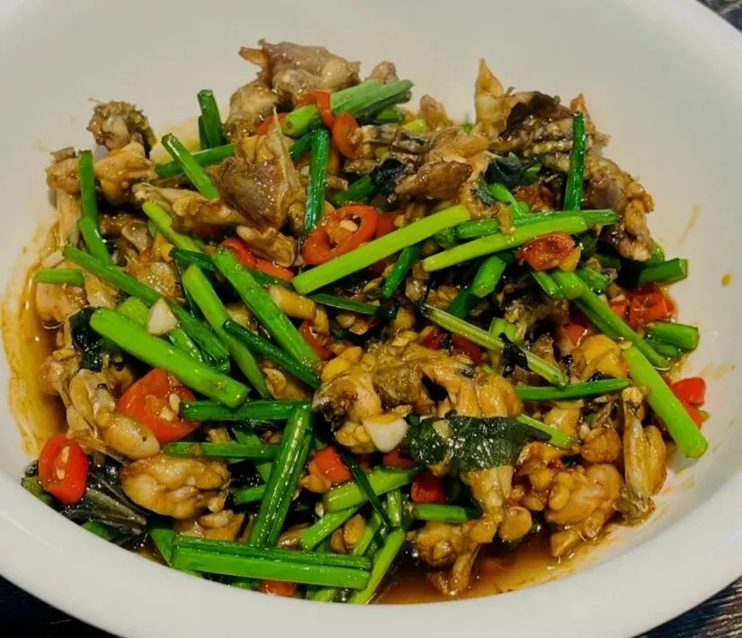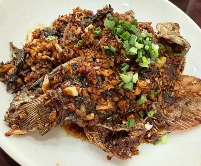 芋头炖牛腩,牛肉很大一砣,炖得软烂入味,芋头吸收了牛肉汤的香味,粉糯而咸香,汤很清澈,挺好喝的。腐乳蒸排骨,我不是腐乳的,所以没有试味。仅管朋友们一个劲儿的说肉很嫩,吃不出什么腐乳味,但对于不吃腐乳的我来说,还是不敢尝试……他们都说排骨又香又嫩,很下饭。爆炒田鸡,肉质嫩滑,大蒜、辣椒、紫苏、韭菜花提味增香,炒得咸香入味,个人还蛮喜欢这种韭菜花炒得不那么老的感觉,挺清香脆嫩的。炸土鲫鱼,这里的蒸土鲫鱼也受欢迎,但是又炸的就更偏好这种,真是炸得焦香酥脆,搭配干辣椒、大蒜子、紫苏、姜末,特别符合平时不爱吃新鲜河鱼人士的胃口,哈哈。天麻炖鸭,一道大菜!从小就认准了天麻炖鸭有预防和治疗头痛的作用,所以喝了很多这个汤,里面的鸭肉也炖得软烂脱骨,肉也不柴,大家都蛮喜欢。他家还有炒肥肠、胡椒猪肚、爆炒腰花、鳝鱼、发肉等菜品,选择还是挺多的。