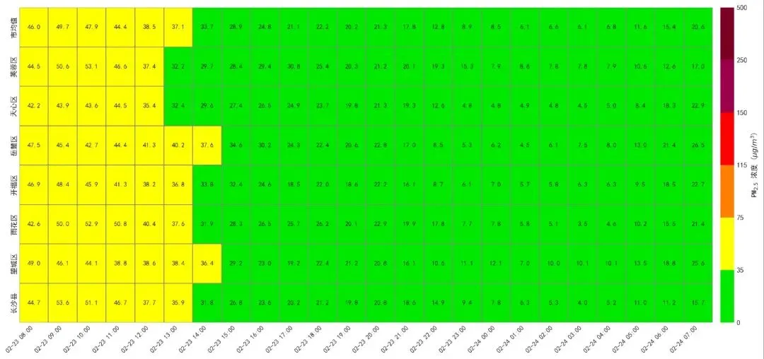 此时间段,湖南省空气质量整体为优,长沙市空气质量为优。利用小时百米级PM2.5精细化制图技术,对长沙市大气污染演变特征进行全时空监测。污染物浓度在23日9时触及峰值49.7μg/m³后开始持续回落,至24日3时降至低谷6.1μg/m³,随后,浓度再次回升,截至24日7时已升至20.6μg/m³。