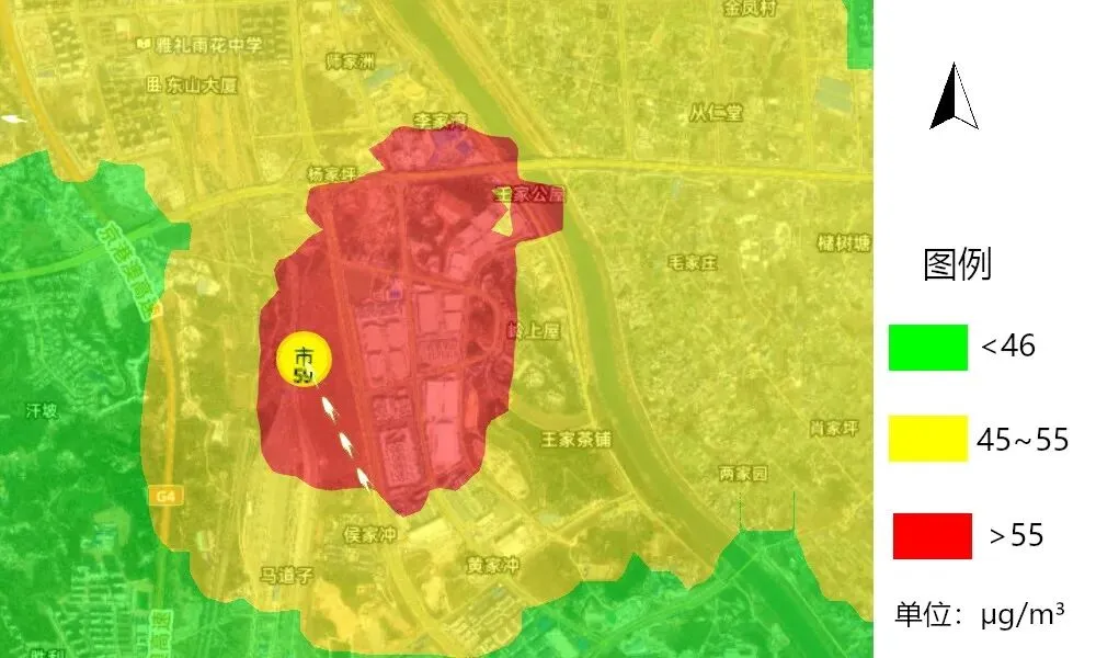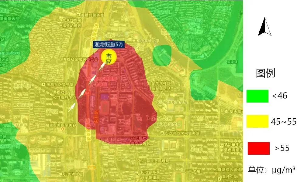 污染高值靶区主要有:东山街道监测站附近(9时,59μg/m³),湘龙街道监测站附近(9时,57μg/m³),赤岭路街道监测站附近(9时,56μg/m³)。