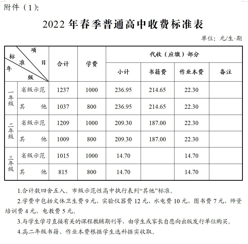二、普通高中学费标准分省级示范性高中和其他高中两个档次,具体收费标准见《2022年春季普通高中收费标准表》附件(1)。普通高中学校免收家庭经济困难等政策范围内学生学杂费和教材费。