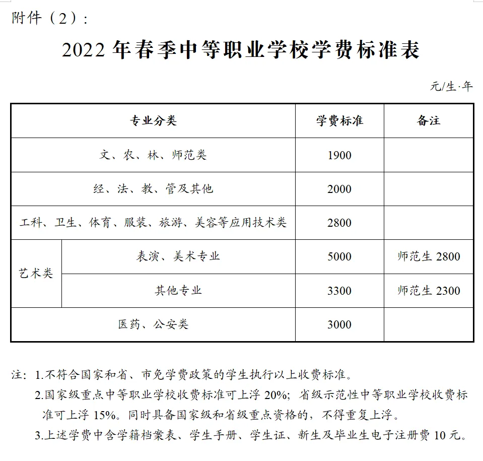 三、中等职业学校学费标准见《2022年春季中等职业学校学费标准表》附件(2)。实行学分制的职业学校(含中专)收费标准,另行文下达。根据《长沙市中等职业教育学生免学费工作实施办法》(长政办函〔2016〕202号)文件精神,继续对公办中职学校(技工学校)和职业教育行政管理部门依法批准、符合国家标准的民办中职学校(技工学校)全日制在籍在校学生(艺术类相关表演专业学生除外)免除学费。