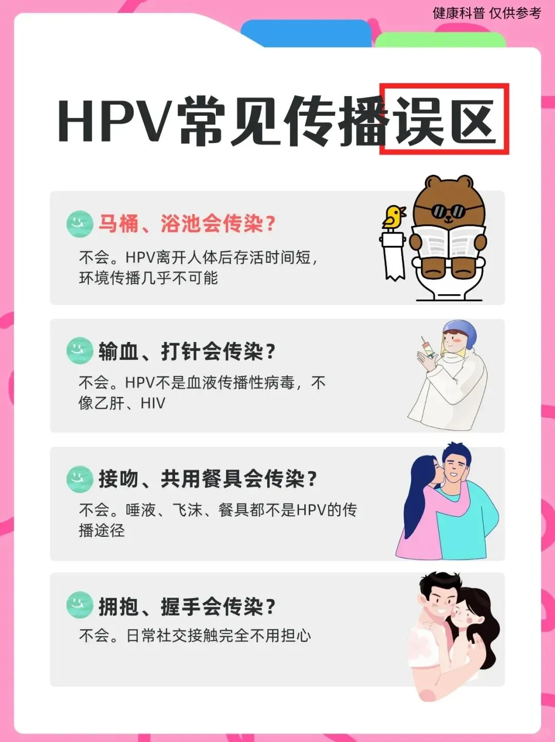 - 无症状携带:实际上,约80%的女性一生中至少会感染一次HPV,但绝大多数感染(约90%)可在1-2年内被人体免疫系统自行清除,不会引发明显症状。