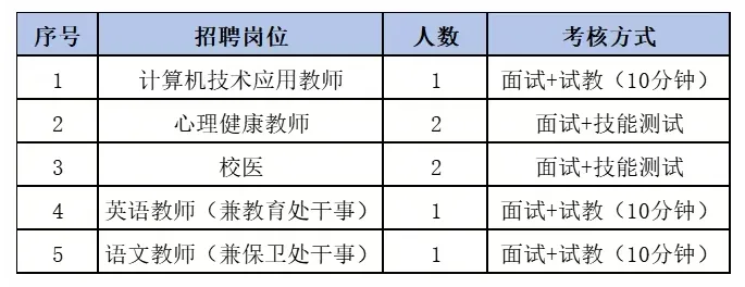 (2)考核:教师岗位为面试、试教(10分钟),其他岗位为面试、技能测试。