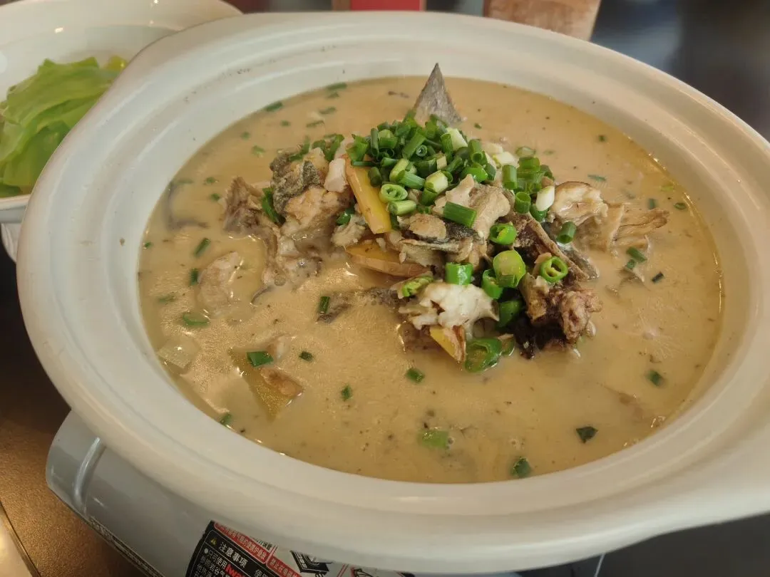 这道菜跟前面吃的武谭鱼很像,也是草鱼切片,鱼片煎炸过,熬出奶白的鱼汤。上次配的是嫩豆腐,这次是千张。好吃,汤汁照样可以干2碗米饭。