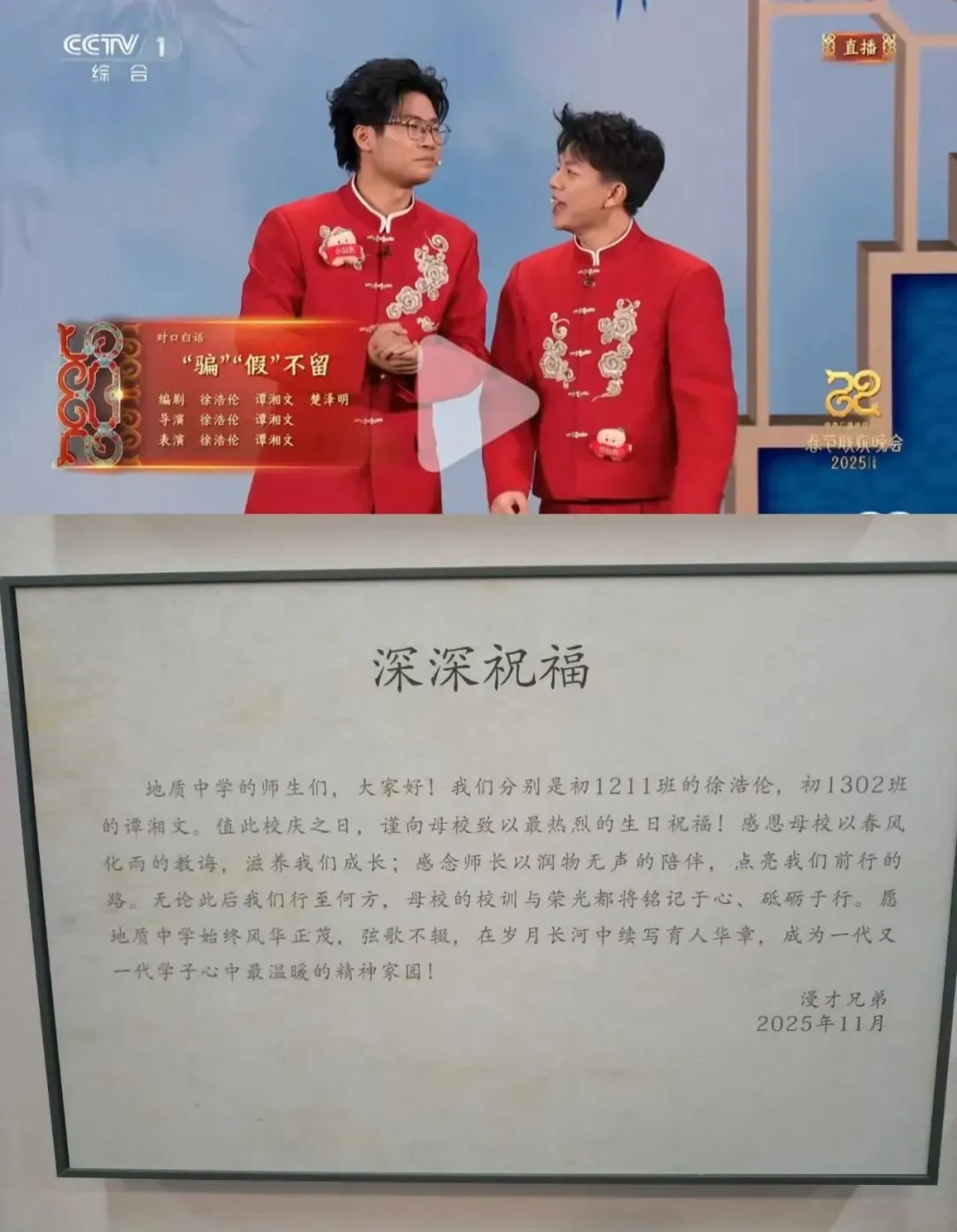“严格、勤奋、求实、创新”,这八字校训始终映照在他们的艺术道路上。看到学生在春晚舞台绽放光彩,母校老师倍感骄傲。谭湘文的初中班主任黄苗苗说:“他还是那个能为身边人带来欢笑的孩子,只是如今,他把这份快乐带给了全国观众。”徐浩伦的老师亦感慨:“从初中演讲台到春晚舞台,他始终沉稳如初。这就是我们地中学子的模样!”