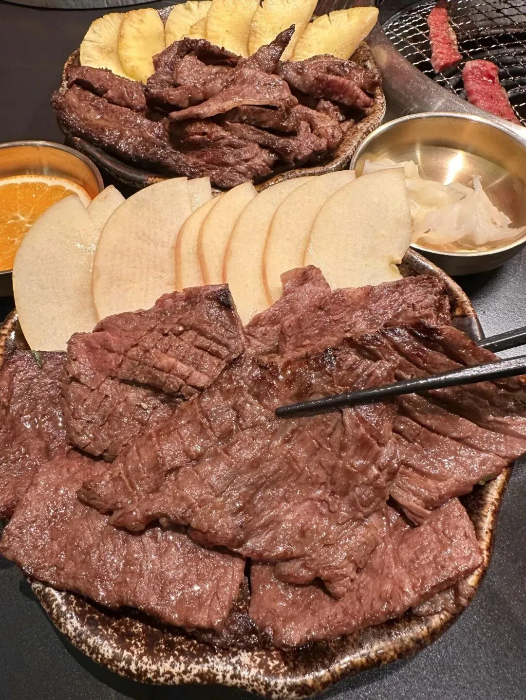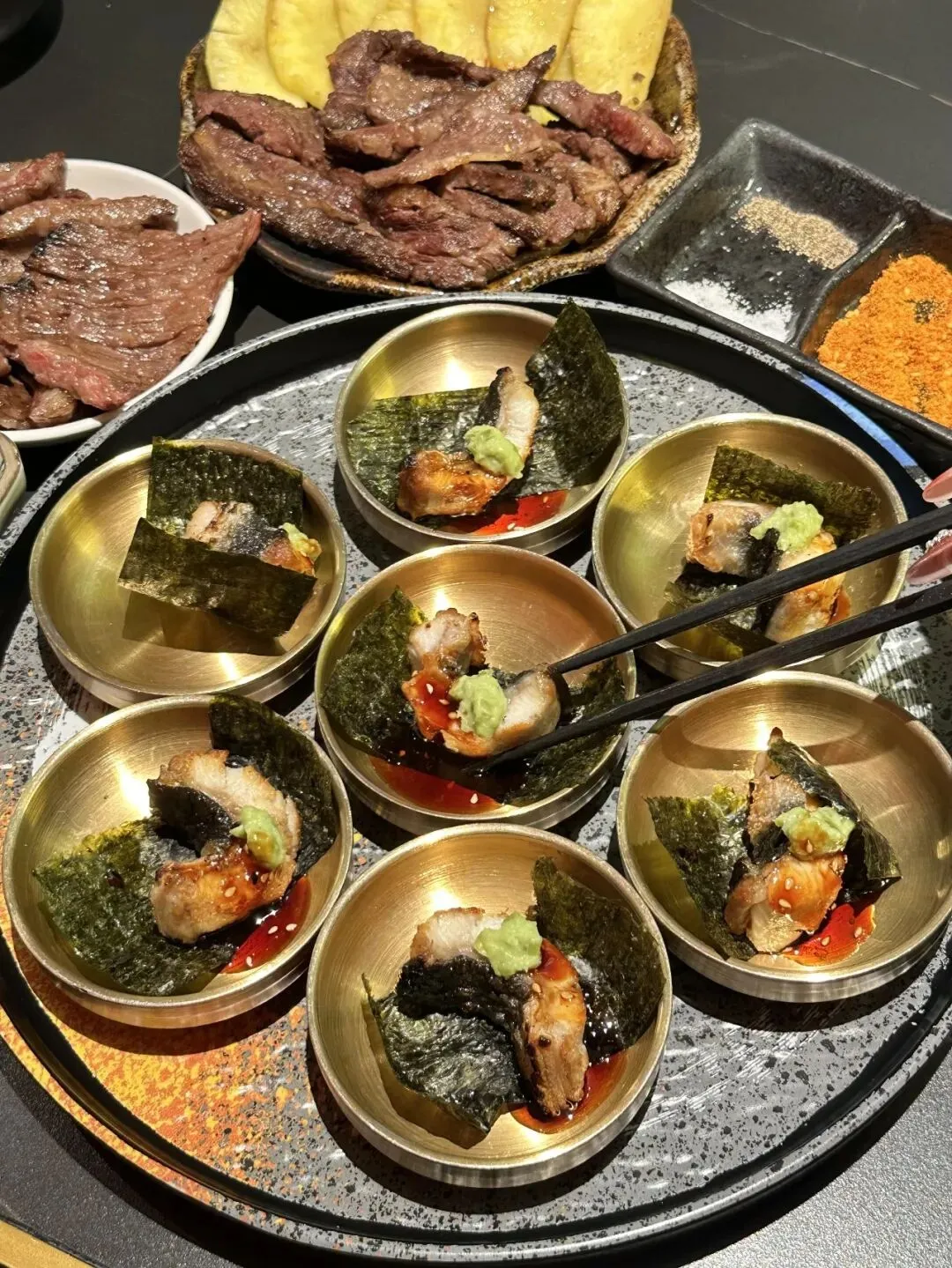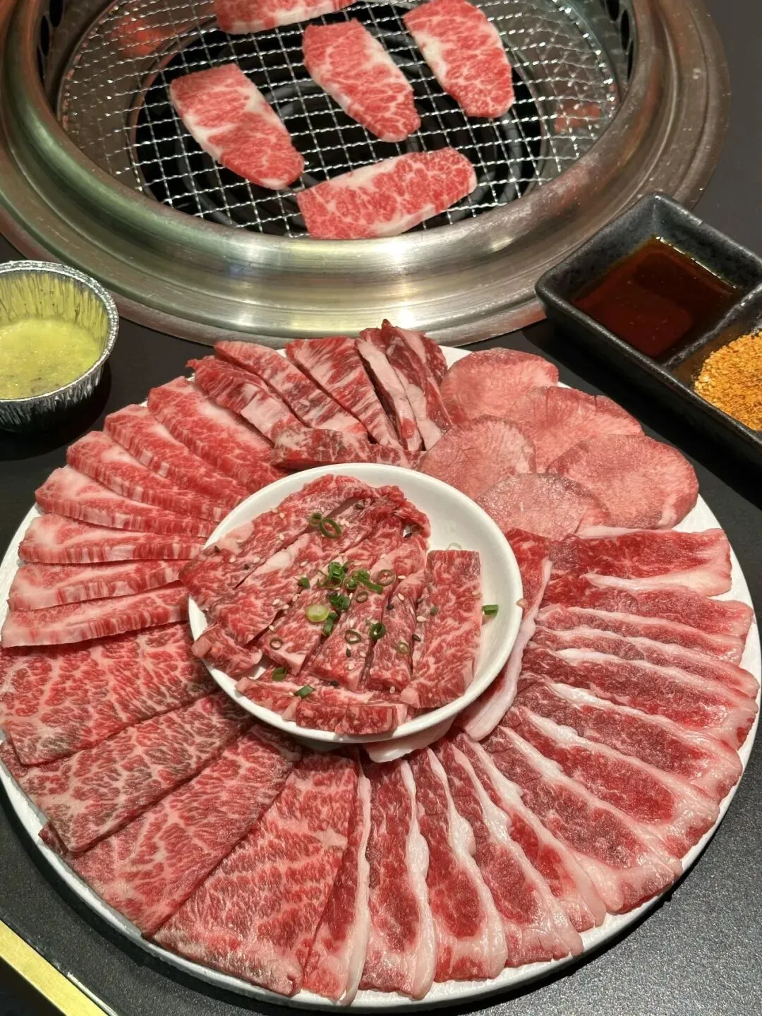 他家烤肉真的是TOP1的存在!他们家主打性价比的和牛:牛五花、牛肋条、牛上脑等等……点大拼盘就可以吃得巨满足!