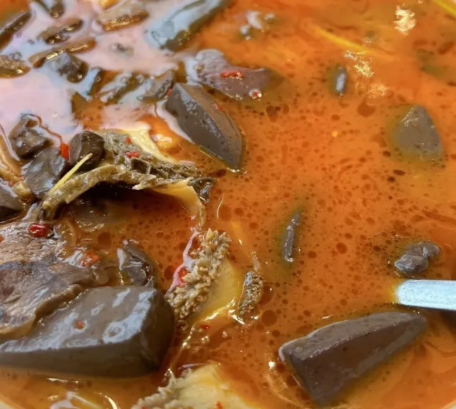 【新化三合汤】这道菜是当地的魂。做法其实挺“野”:选新鲜的黄牛里脊肉、牛百叶,还有最关键的牛血,切成薄片。起锅烧油,把干红辣椒炸香,倒入姜蒜米醋,再加山泉水煮沸。三样主料一下锅,大火猛攻,断生即出。汤色红亮,喝一口,酸、辣、鲜在舌尖打架,专治各种没胃口。