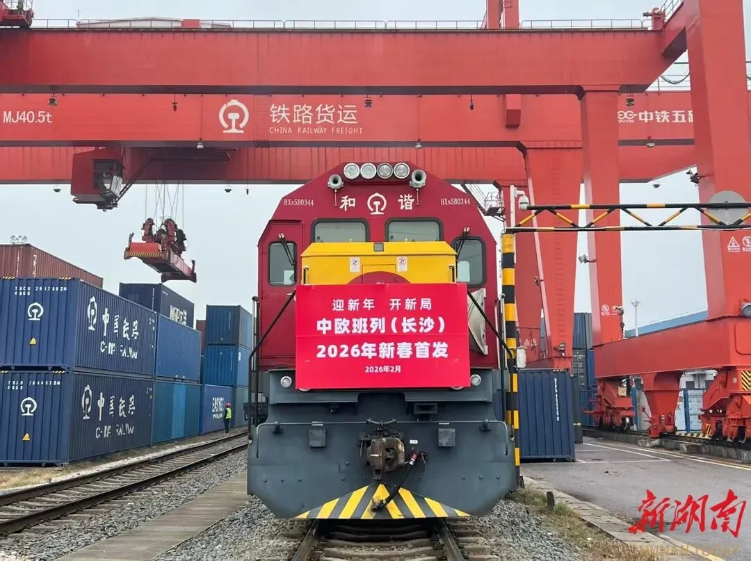 正月初八,经长沙海关所属星沙海关监管放行,一列满载电子产品、日用百货及工程机械配件的中欧班列(长沙)从长沙北站鸣笛启程。2026年春节期间,中欧班列(长沙)“不打烊”,保持常态化开行,进出口共发运34列,同比增长127%。其中出口20列,进口14列。